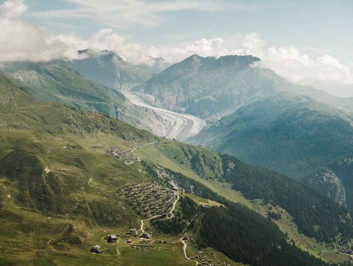 Als Wirtschaftsraum verlieren die Alpen an Bedeutung, die Landwirtschaft in den Bergen stirbt aus und der Klimawandel bringt nicht abschätzbare Veränderungen mit sich. Es stellt sich die Frage, wie die Wiesen in Zukunft bewässert werden, wenn die Gletscher verschwunden sind? Wie verändert sich der Tourismus, wenn im Winter der Schnee wegbleibt? Mit solchen Fragen setzt sich die Ausstellung auf dem Aletsch Campus in Naters auseinander.