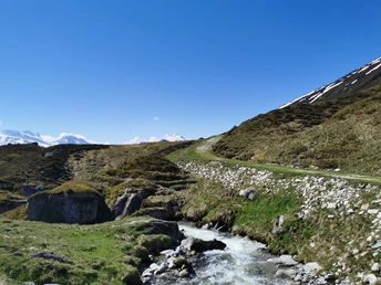 Von der Bergstation der Pendelbahn geht es zunächst bis zur Chiematte. Wer möchte, kann sich hier vor der weiteren Wanderung noch eine kleine Stärkung gönnen. Über Alpwiesen geht es nun zum Kelchbach und dann folgt ein kurzer Aufstieg zur Suone Nessjeri.