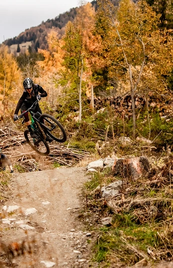 At the beginning of the descent, you are led via a forest road at about 1950 m above sea level, from where the actual trail then leads over the Bättulhirmi into the protective forest above Blatten. The route includes winding sections in clearings and repeatedly offers small jumps in straight sections, which can also be bypassed. Past old hamlets and green meadows, you reach an open forest section in the lower part, which was completely newly created and has the character of a flow trail. At the end, you reach the road again via the last clearings, which leads back to the cable car station in about 250 m.