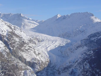 This is an easy and short 30-minute winter hike. From the Aletschbord there is a fantastic view of the Great Aletsch Glacier in its winter guise. The Great Aletsch Glacier is part of the UNESCO Jungfrau-Aletsch World Heritage Site. In terms of area, it is the largest and longest glacier in the Alps. The glacier is 22.75 kilometres long.