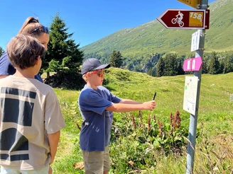 Tout au long du parcours, tu trouveras des panneaux du sentier audio qui te permettront d'écouter les dernières aventures de la petite sorcière de Belalp, Vero.