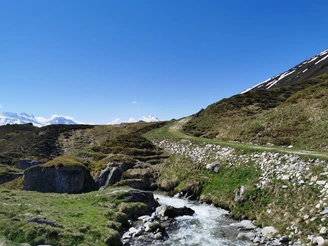 Depuis la station supérieure du téléphérique, on se rend d'abord à la Chiematte. Ceux qui le souhaitent peuvent prendre un petit rafraîchissement avant de poursuivre la randonnée. On traverse ensuite des prairies alpines jusqu'au Kelchbach, puis suit une courte montée jusqu'à la suone Nessjeri.