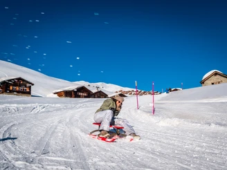 Mit dem Schlitten gewappnet machen sich die Schlittler ab der Bergstation der Gondelbahn auf den Weg. Die Fahrt führt durch eine Chaletsiedlung und die charmante Alpe Bel. Von hier geht es weiter auf der Tätschenstrasse durch den Wald bis hinunter zur Mittelstation Erich/Tschuggen.