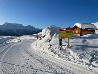 Der Schlittelweg startet direkt am Ausgang der Pendelbahn und folgt dem Strassenverlauf. Kurz vor der Mittelstation Erich/Tschuggen zweigt man von der Strasse rechts ab und fährt über einen Hang hinunter zur Seilbahnstation.